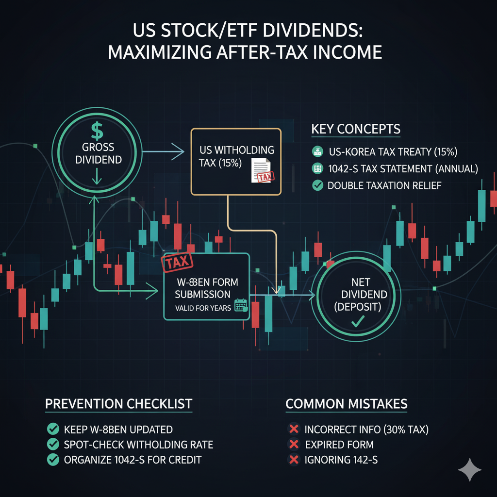 배당의 실입금액 극대화는 조세조약(15%) 이해와 W-8BEN 관리, 그리고 1042-S 사후확인에서 시작합니다. 이 세 가지를 루틴화하면 배당 누수를 구조적으로 줄일 수 있습니다.