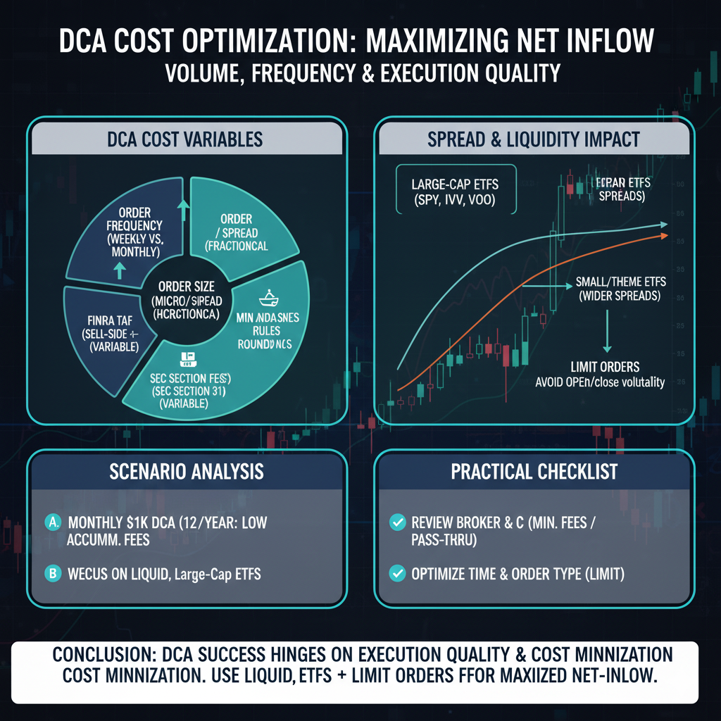 DCA의 성패는 체결 품질과 누적 비용 최적화에 달려 있습니다. 규제비 구조와 최소수수료를 이해하고, 유동성 높은 ETF와 지정가 전략을 조합하면 장기적으로 순유입 대비 순투입을 극대화할 수 있습니다.