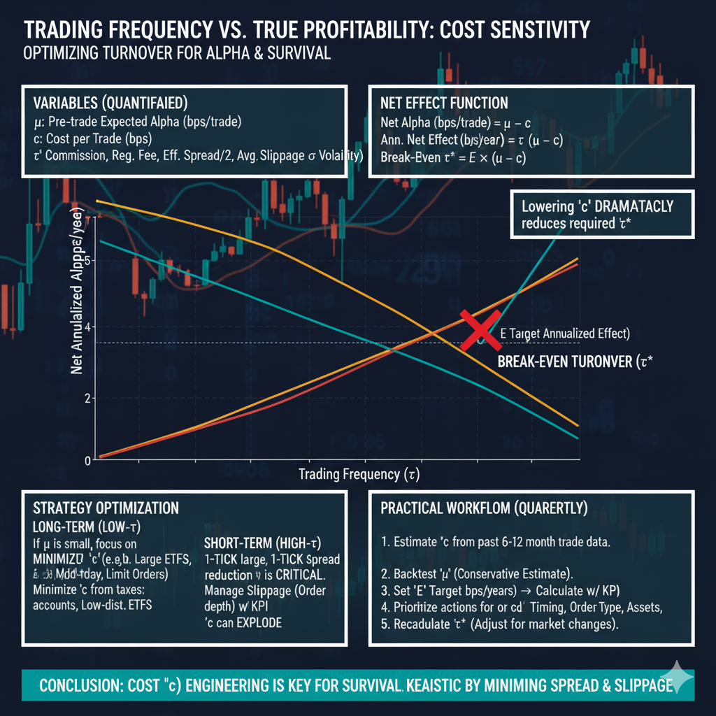 알파(µ) 못지않게 비용(c)을 낮추는 설계가 전략의 생존을 결정합니다. 스프레드·슬리피지 절감으로 임계 회전율을 현실 구간에 두면, 장기·단타 모두에서 순효과를 방어할 수 있습니다.