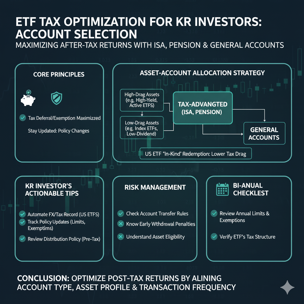 • 과세 드래그 큰 자산(분배 잦은 채권·커버드콜·액티브, 고배당) → 세제형 계좌 우선.